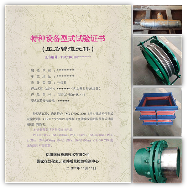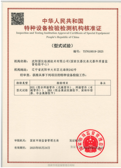 經(jīng)國家市場監(jiān)督管理總局審查,獲準(zhǔn)從事DYX(限非焊接管件(無縫管件)、焊接管件(有縫管件))、DBX(限金屬波紋膨脹節(jié)、旋轉(zhuǎn)補償器、非金屬膨脹節(jié))特種設(shè)備型式試驗檢驗工作。